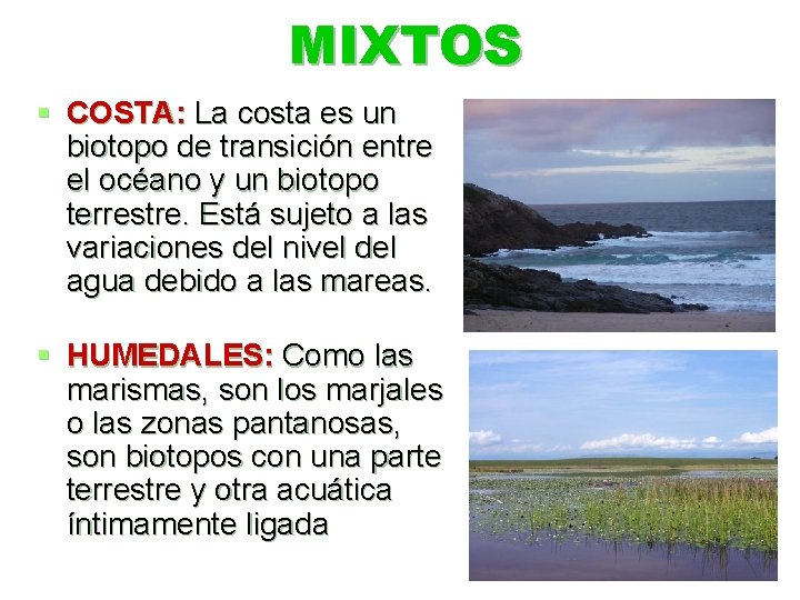 Mares océanos ríos lagod pantanos arroyos y lagunas entre otros. Los ecosistemas mixtos son aquellos ecosistemas que comparten características tanto de los ecosistemas terrestres como de los acuáticos resultando en un ecosistema híbrido entre ellos donde habitan especies tanto terrestres como marinas conviviendo. Los ecosistemas acuáticos son todos aquellos ecosistemas que tienen por biotopo algún cuerpo de agua como pueden ser.